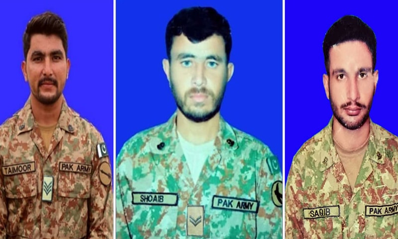 The martyred soldiers have been identified as 30-year-old Havaldar Taimoor, a resident of Jhelum; 38-year-old Naik Shoaib, a resident of Attock; and 24-year-old Sepoy Saqib Nawaz, a resident of Sialkot.