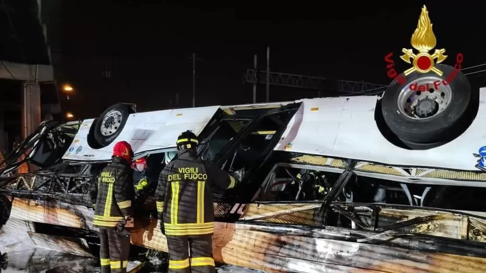 The bus broke through a barrier and plunged near railway tracks in the district of Mestre, which is connected to Venice by a bridge.