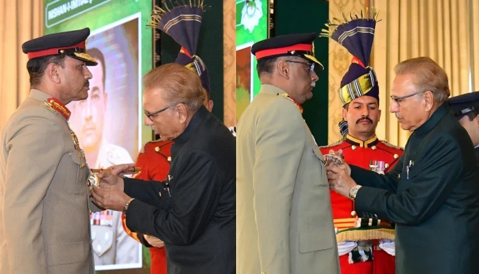 President Dr Arif Alvi on Thursday conferred Nishan-e-Imtiaz (Military) upon Chief of Army Staff (COAS) General Syed Asim Munir and Chairman Joint Chiefs of Staff Committee (CJCSC) Sahir Shamshad Mirza.