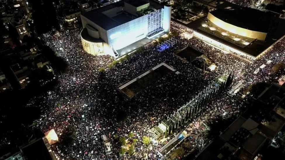 The BBC’s Samantha Granville in Tel Aviv saw protesters draped in Israeli flags, carrying posters in Hebrew, and pictures of Mr Netanyahu with X’s over his mouth.