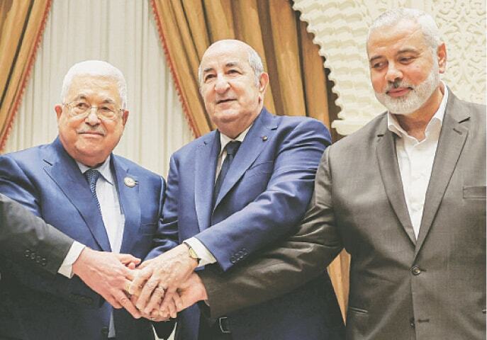 ALGIERS: Palestinian president Mahmud Abbas and Hamas leader Ismail Haniyeh met publicly for the first time in over five years, on the sidelines of Algerian independence anniversary celebrations.