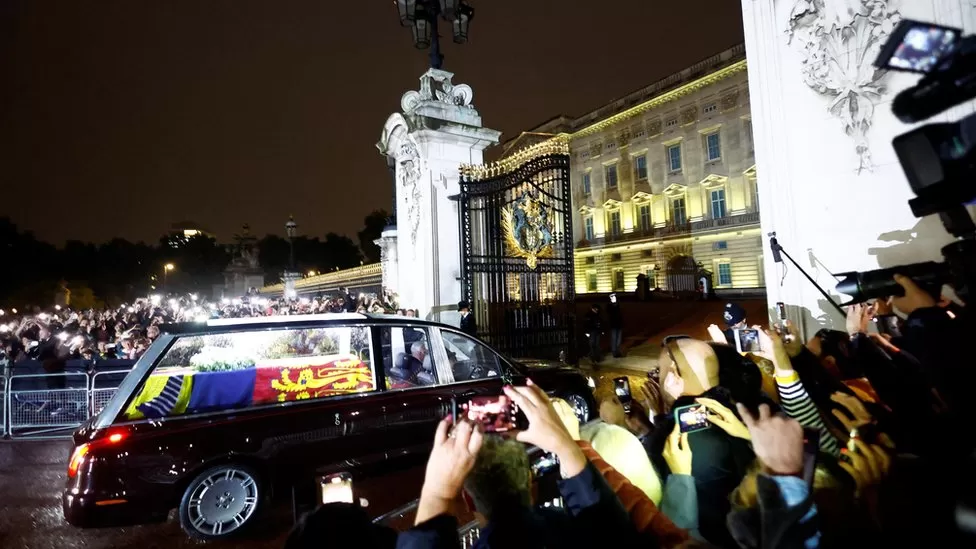 There was applause from the thousands gathered outside as the hearse arrived at the palace. Shouts of “hip, hip hooray” were heard as the sombre mood gave way to respectful celebration of the late Queen.
