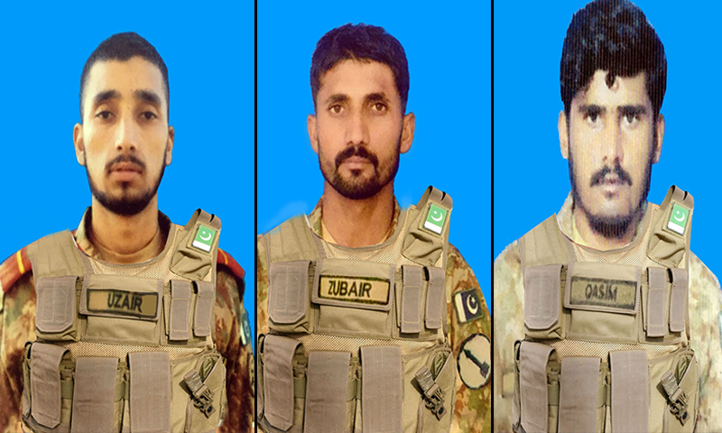 The three martyred soldiers were identified as Lance Havaldar Zubair Qadir, Sepoy Asghar and Sepoy Qasim Maqsood.
